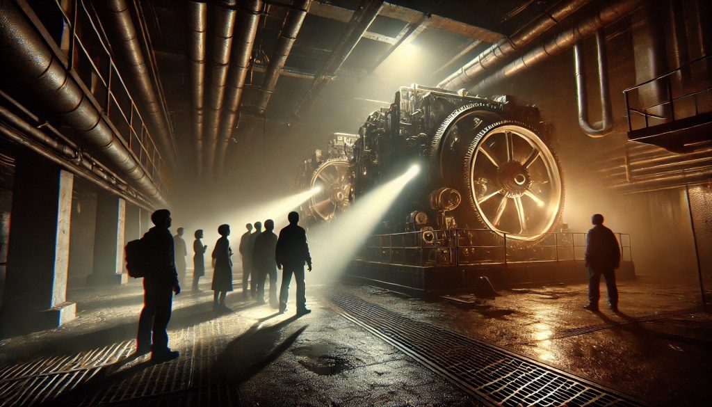 Kun he yrittivät tulkita seinälle ripustettuja johtolankoja, ääni käytävästä voimistui. Heidän oli jätettävä huone ja etsittävä toinen reitti ulos. Käytävä haarautui, ja he valitsivat oikeanpuoleisen polun, joka johdatti heidät vanhan metallisen oven luo. Oven takana ei kuitenkaan ollut ulospääsyä – se johti avaraan tilaan, jossa oli valtava, kammottava kone. Laitteessa vilkkuivat valot, ja sen sisällä näkyi vanhanaikainen levy, joka pyöri hitaasti.